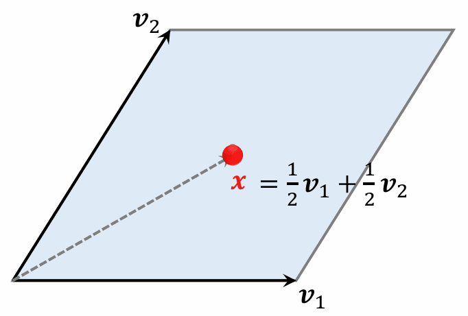 x=α1v1+α2v2.\mathbf{x} = \alpha_1 \mathbf{v}_1 + \alpha_2 \mathbf{v}_2.