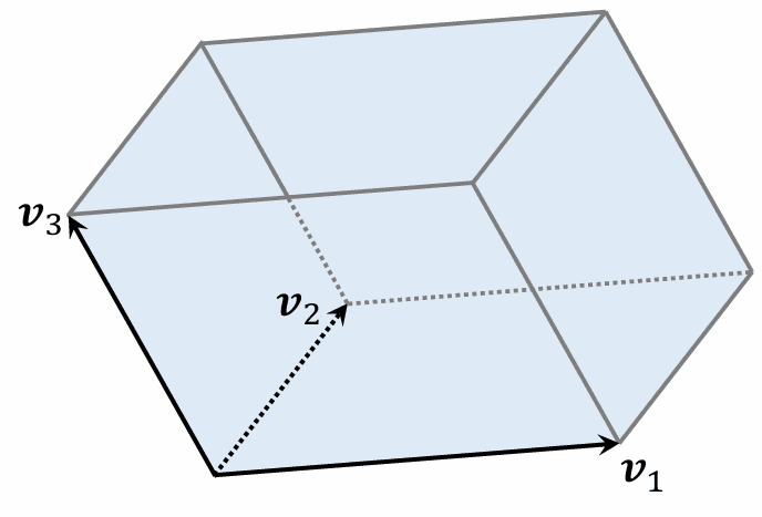 • 平行四边形 P(v1,v2)P(\mathbf{v}_1, \mathbf{v}_2) 是平行六面体 P(v1,v2,v3)P(\mathbf{v}_1, \mathbf{v}_2, \mathbf{v}_3) 的底。